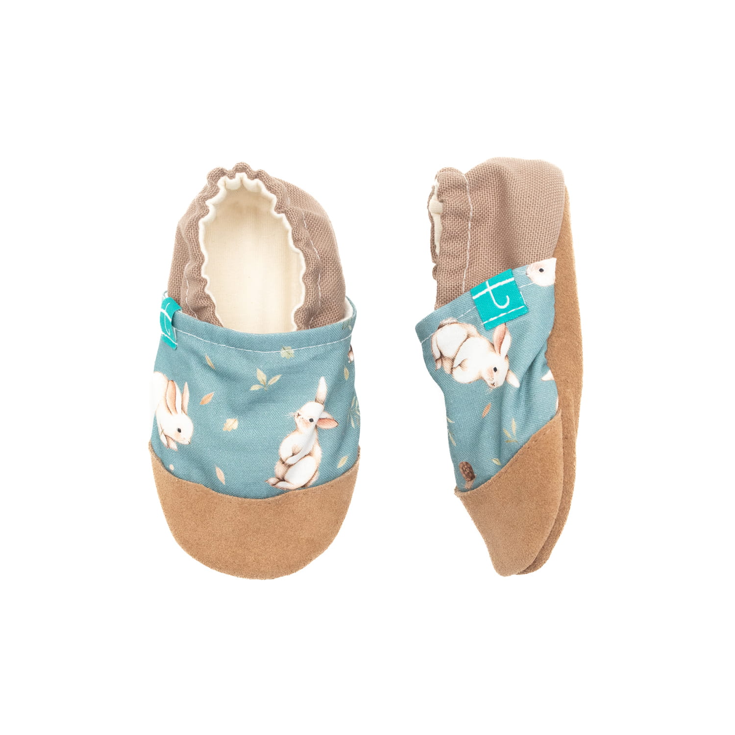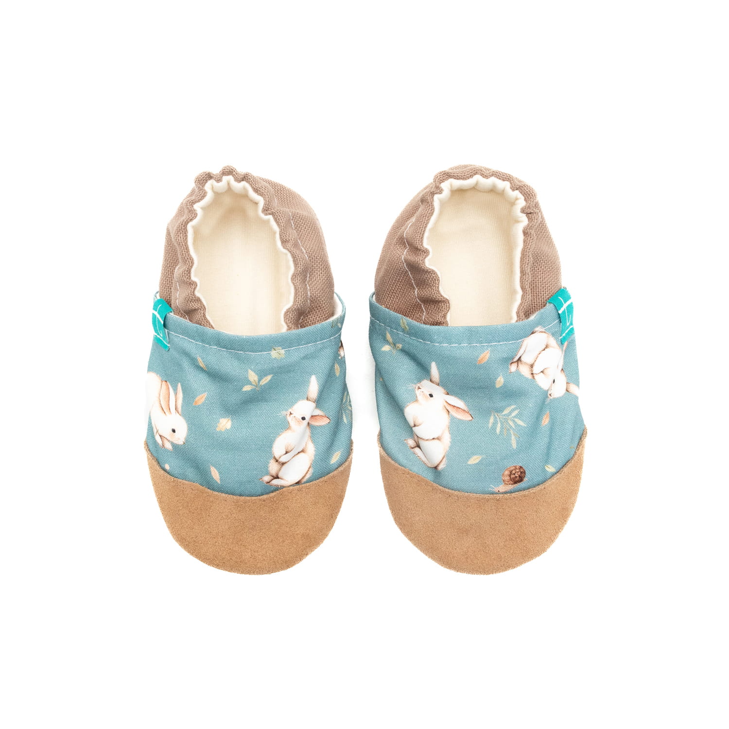 Urocze kapcie typu soft sole, idealne na pierwsze kroczki jak i dla większych maluchów. Szyte ręcznie z najwyższej jakości materiałów, są bardzo miękkie i lekkie dzięki czemu dziecko czuje się w nich jak na boso, dzięki bambusowej tkanine znajdującej się we wnętrzu kapciuszka oraz zastosowaniu w produkcji naturalnych materiałów stópka nie poci się. Ponadto w podeszwie użyto bawełnaniengo wypełniania, który powoduje, że stopa jest lepiej odizolowana od podłoża a same kapcie są wygodniejsze.