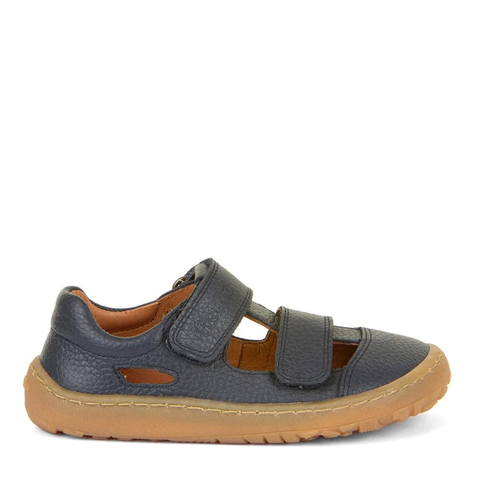 Froddo Barefoot Sandal to sandałki dziecięce z zakrytymi palcami wykonane z wysokiej jakości skóry. Świetny kształt buta, dobra elastyczność podeszwy i doskonałe wykonanie to ich główne cechy. Model z dwoma rzepami będzie odpowiedni na stopy normalne i te z wyższym podbiciem. W modelu Barefoot Sandal na uwagę zasługuje bieżnikowana podeszwa, która jest jeszcze bardziej elastyczna i razem z miękką cholewką zapewnia świetną pracę buta. Dzięki skórzanej cholewce i wysoko podniesionej podeszwie buty sprawdzą się w wilgotnych warunkach. Jak w wypadku każdego skórzanego obuwia zalecamy ich impregnację dla zwiększenia odporności na wilgoć i wodę.