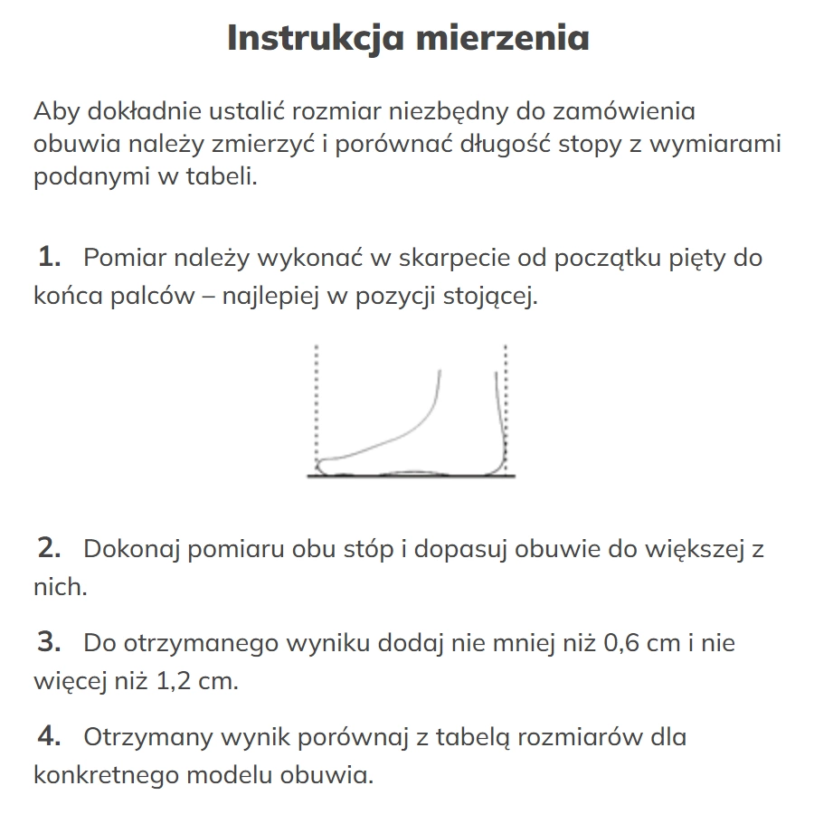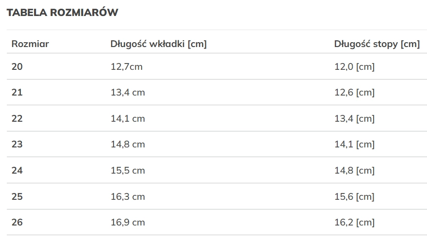 | Rozmiar | Długość wkładki [cm] | Długość stopy [cm] |