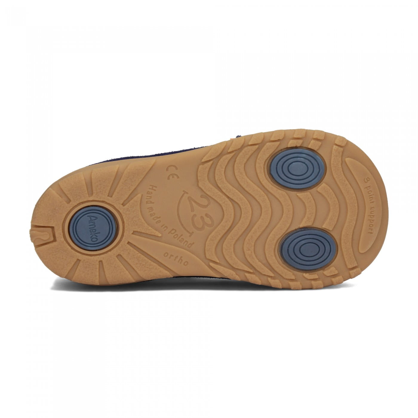 Wewnątrz bucika zastosowaliśmy bezchromową skórę podszewkową. Dodatkowo wewnątrz bucika została zastosowana wkładka samoprofilująca, która dopasowuje się do stopy. Trzewiki są bardzo miękkie a jednocześnie wyprofilowana i odpowiednio usztywniona pięta zapewnia właściwe podparcie dla rozwijającej się stopy dziecka. Buciki posiadają podeszwę z 3 punktami podparcia, która jest bardzo elastyczna i wspomaga kształtowanie prawidłowej postawy ciała.