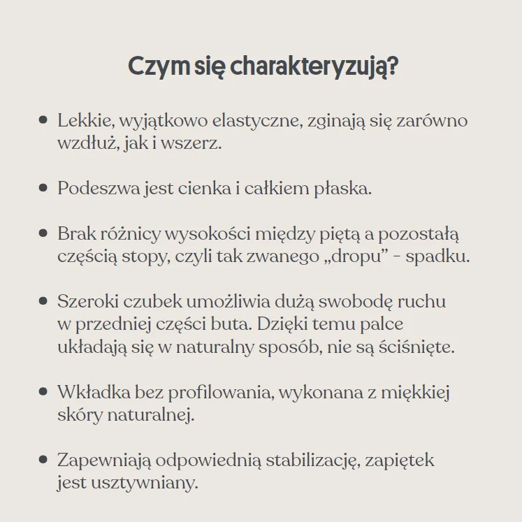 Trzewiki dziecięce z kolekcji BAREFOOT. Buty tworzą wrażenie chodzenia boso.Ultramiękka i elastyczna podeszwa Usztywniony zapiętek stabilizuje stopę. a zapięcie na rzep pozwala na dopasowanie obuwia do jej tęgości. Zaokrąglony nosek oraz szeroka podeszwa gwarantują stabilność i wygodę użytkowania. Podeszwa „zero drop”- płaska, brak różnicy w wysokości pięty do pozostałej częsci spodu. Komfortowa, płaska wkładka wykonana jest z naturalnej skóry.