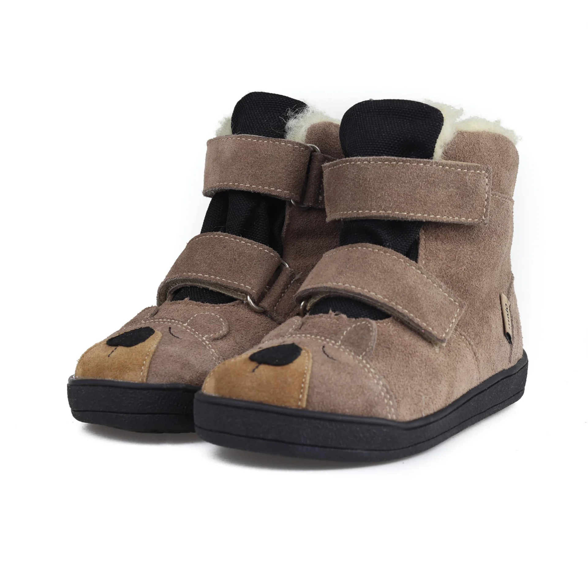 Zimowe trzewiki wodoodporne z membraną te-por w typie barefoot. Wykonane z wysokojakościowej skóry naturalnej- welurowej. Podszewka z wodoodporną membraną oraz wełną 100%. Trzewiki zapinane są na rzepy. Komfortowa i ocieplana wkładka z warstwą termoizolacyjną. Dzięki usztywnianej pięcie i elastycznej podeszwie, wspierają prawidłowy rozwój stopy. Odpowiednie na temperaturę poniżej 0ºC.